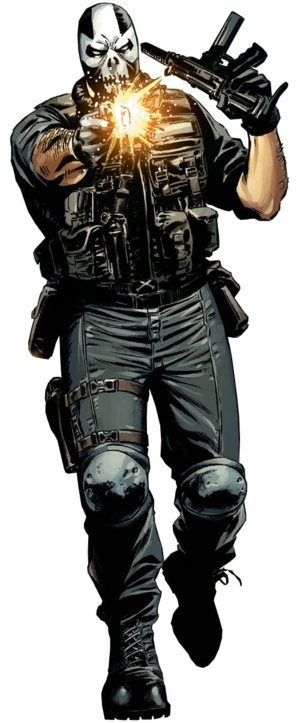 - Costume: Typically wears black tactical body armor, reinforced vests, and combat fatigues.