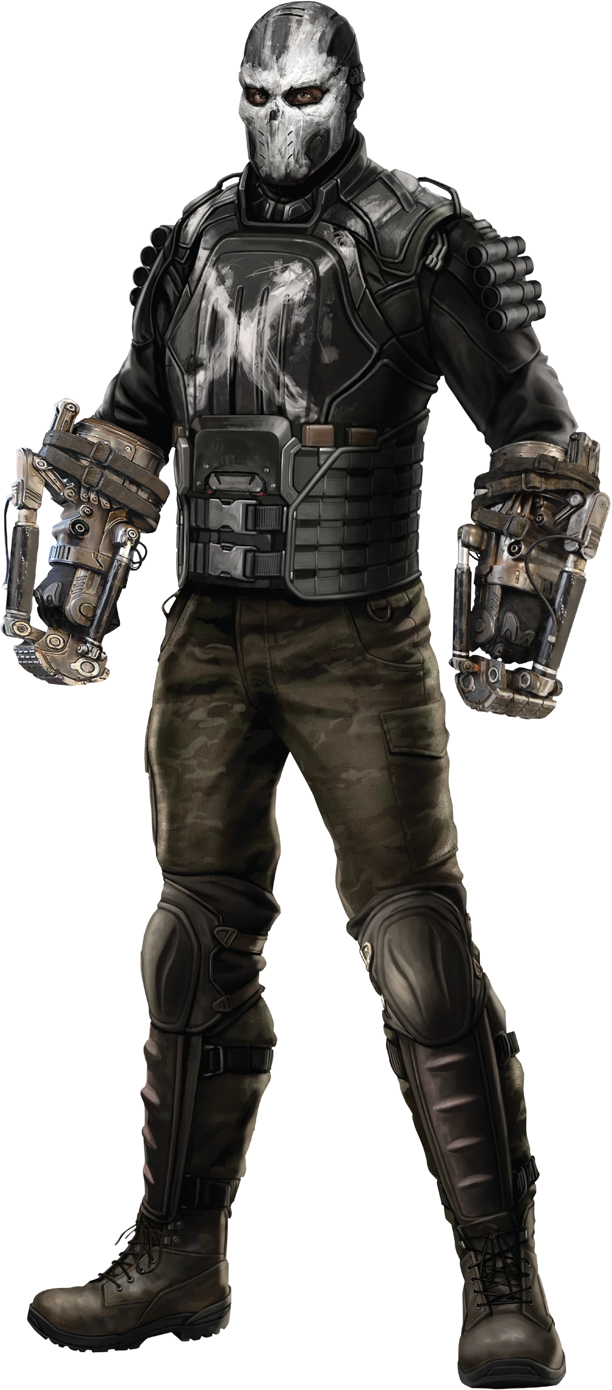 Crossbones is characterized by his imposing, muscular physique and his signature tactical gear. His most iconic visual element is his black mask featuring a white stylized skull pattern, which serves both as intimidation and a symbol of his lethality.